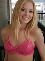 MPX Girls -> Skye Model: Perky teen Skye Model shows off in a sexy skimpy little pink lace bikini top that barely covers anything