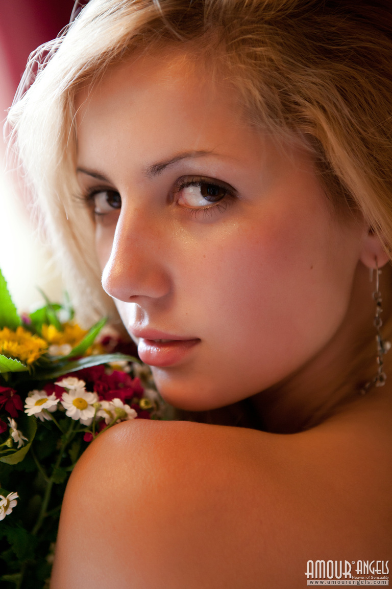 MPX Girls -> Amour Angels: Amazing teen honey in tempting black stockings posing on bed with a bouquet of flowers.
