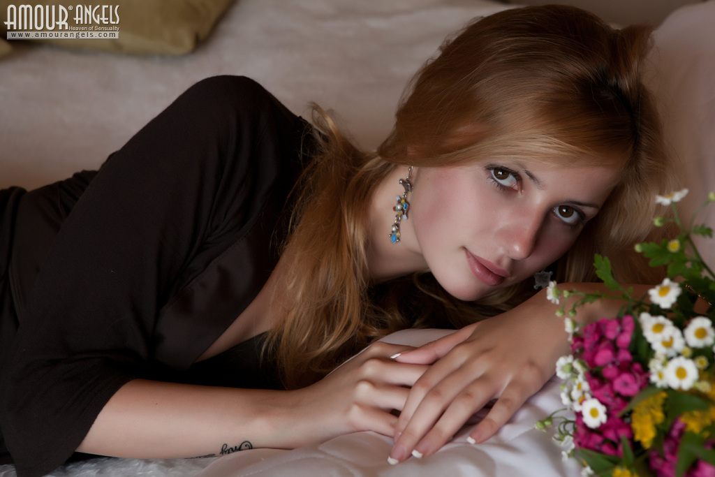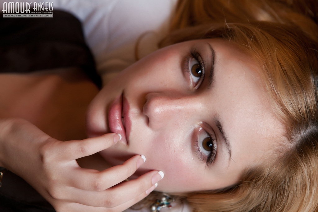 MPX Girls -> Amour Angels: Beautiful teen cutie in sexy black stockings showing her tasty shaved pussy and ass on bed.