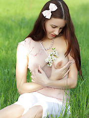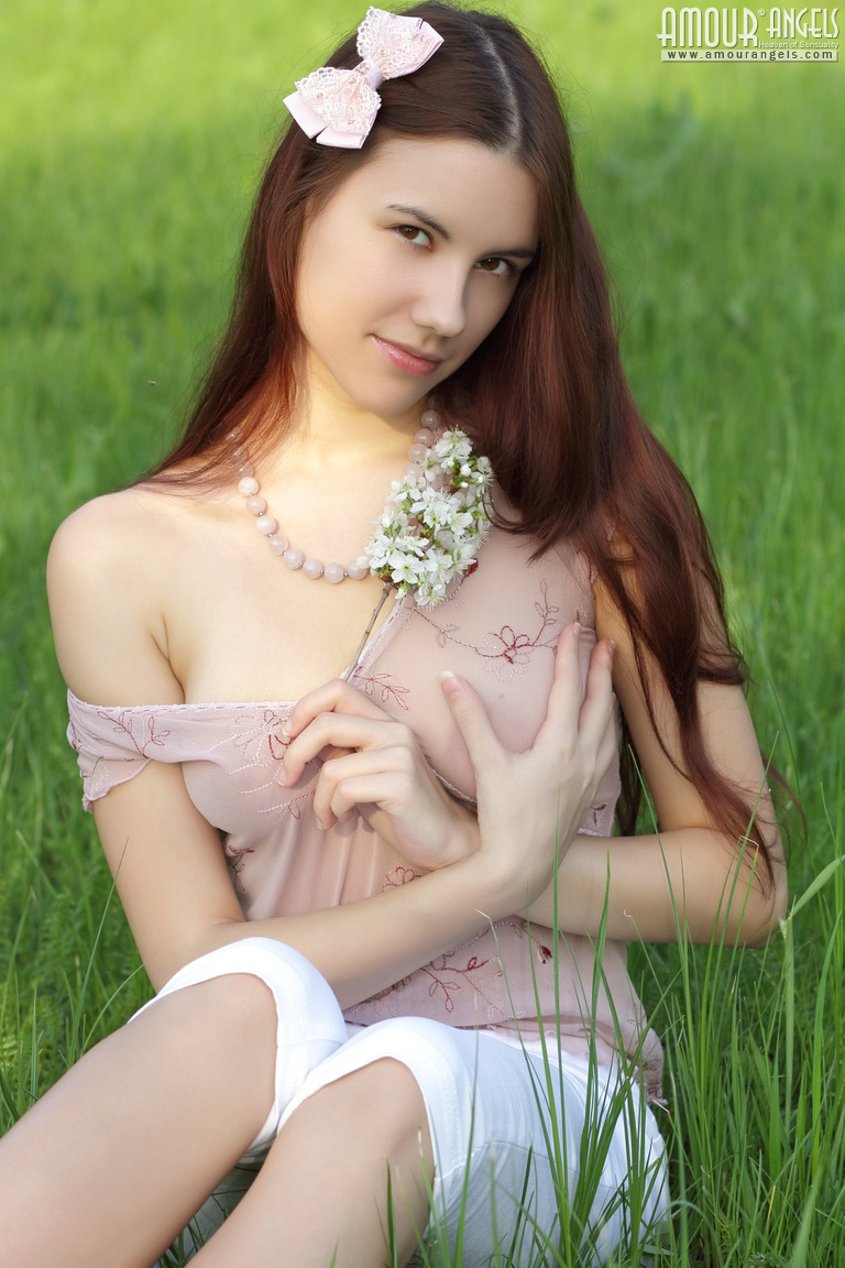 MPX Girls -> Amour Angels: Charming teen peach with a bow in her hair undressing and showing luxurious body in a field.